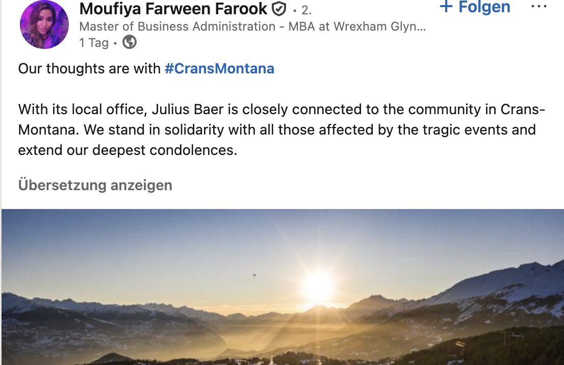 Bär sei „closely connected to the community in Crans-Montana“. Der neue Schweiz-Chef der Privatbank teilte die Trauerbotschaft auf seinem LinkedIn.