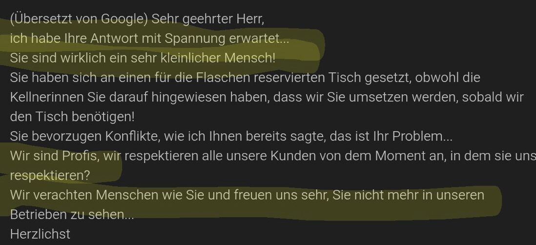 „Wir sind Profis, wir respektieren alle unsere Kunden von dem Moment an, in dem sie uns respektieren? Wir verachten Menschen wie Sie und freuen uns sehr, Sie nicht mehr in unseren Betrieben zu sehen.“