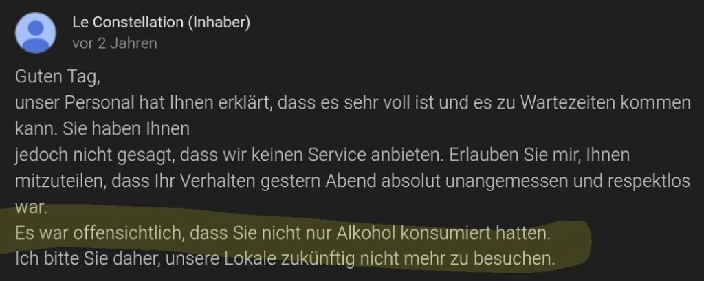 „Ihr Verhalten gegenüber unseren Mitarbeitern war jedoch sehr unangemessen, ja sogar verächtlich. In unserem Haus dulden wir keine Respektlosigkeit, daher sind Sie nicht mehr willkommen!“ Hausverbot.