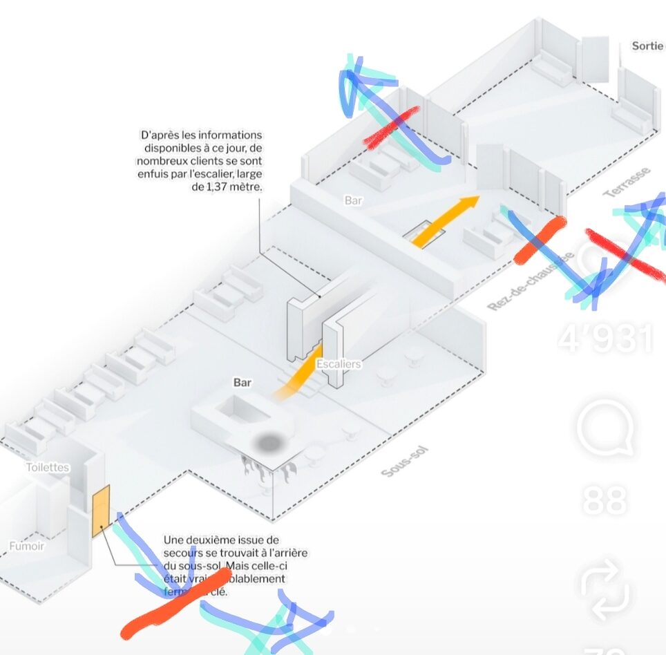 Eine Skizze zeigt die verschiedenen Fluchtwege, von denen praktisch alle keine Rettung versprachen. Im Partyraum im Sous-sol kamen die Gäste, darunter 14-Jährige, nicht durch die ominöse Tür.