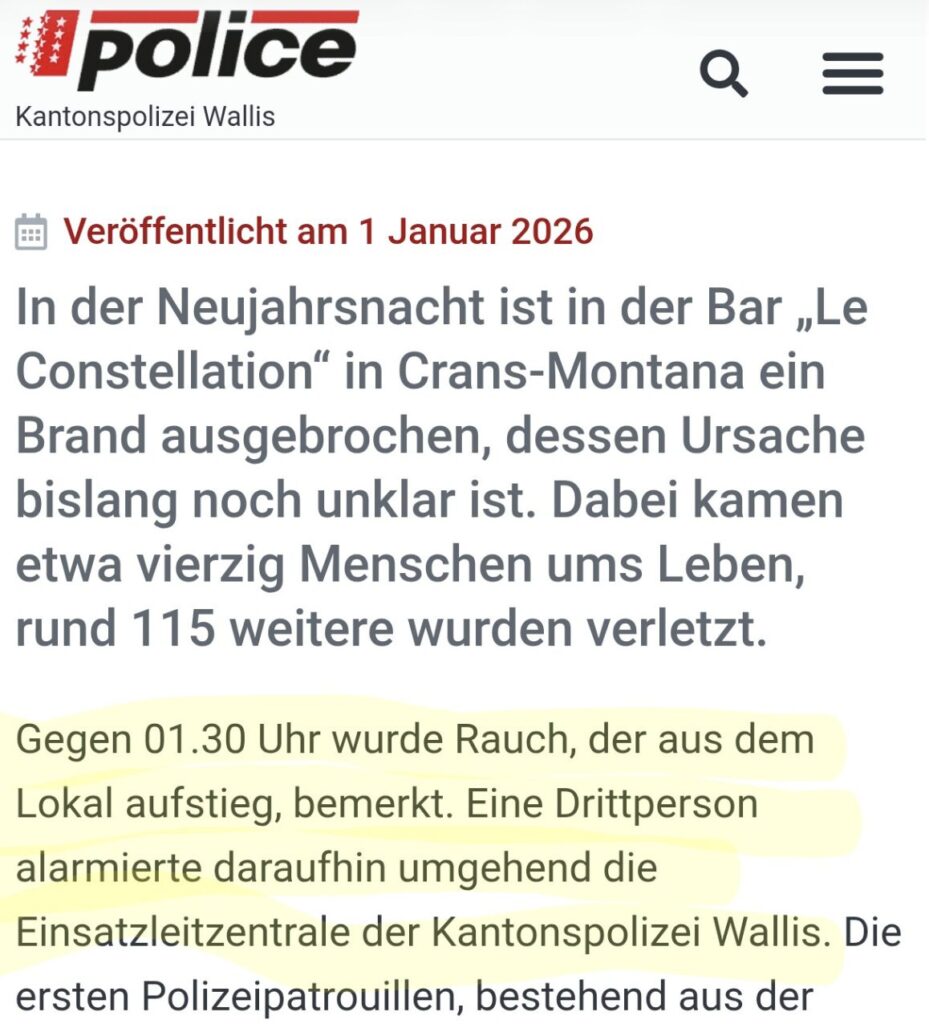 Umso tragischer ist es, dass die – mittlerweile überall bekannt – heillos überforderte sog. „Generalstaatsanwältin“ Pilloud viele Tage völlig untätig war. Sie hätte mindestens die Morettis und den Gemeindepräsidenten von Crans-Montana sofort einbuchten müssen.