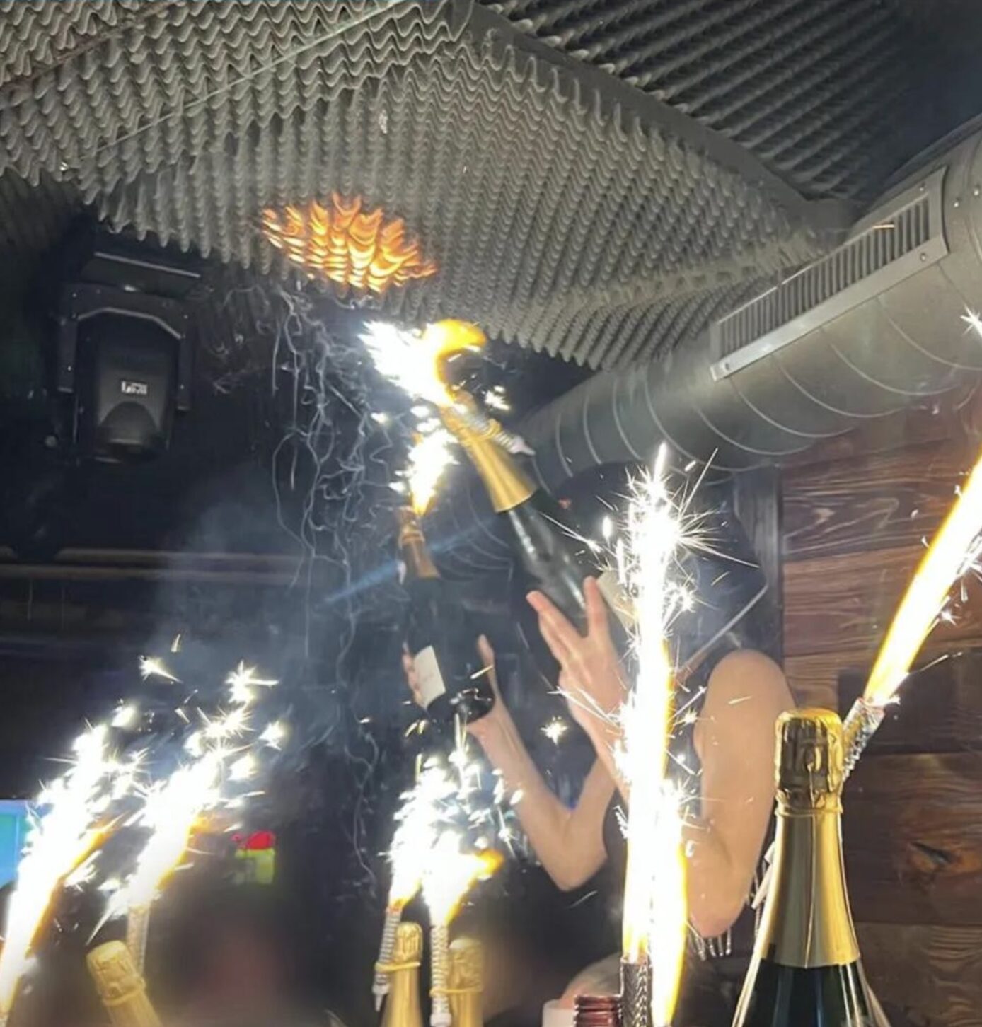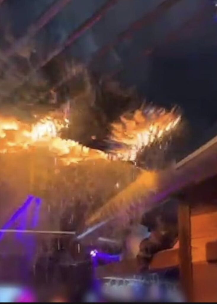 Auf den Videos sieht man, die die jungen Leute weiter ausgelassen unter dem Feuer an der Decke weiter tanzen und grölen und der DJ weiter Musik spielt.