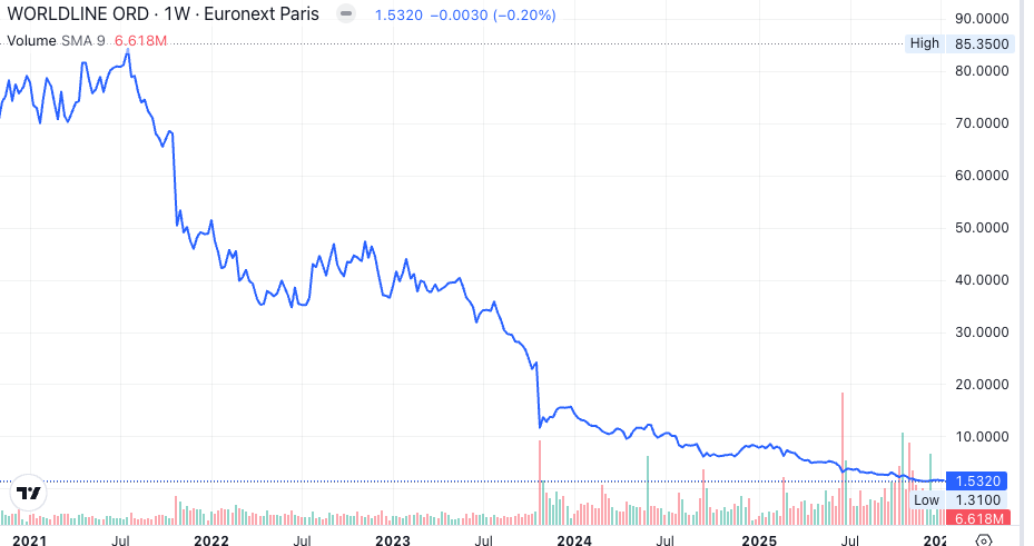 Noch viel dramatischer entwickelte sich die Worldline. Deren Aktie begann zu bröckeln – und ging dann in Sturzflug Richtung Keller über.