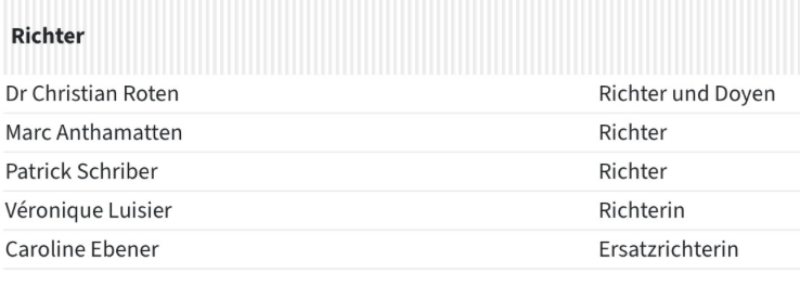 Bei den vier Richtern, Doyen Dr Christian Roten, Marc Anthamatten, Patrick Schriber und Véronique Luisier, sind per April 2025 keine Parteizugehörigkeiten vermerkt.