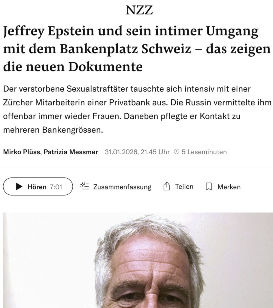 Die jüngste Offenlegung der Epstein-Files hat es in sich. Der Skandal reiche „in die höchsten Kreise des Schweizer Bankenplatzes“, schreibt heute die „NZZ am Sonntag“.