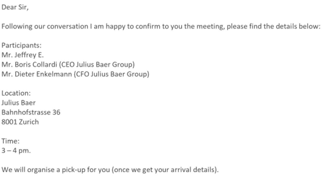 „Dear Jeff“, haute der Bär-CEO am Sonntag, zwei Tage nach der Sitzung an der Zürcher Bankenmeile, auf die Tasten. „Thanks again for your visit. Hope de debrief with A went well. Call me anytime for a chat.“