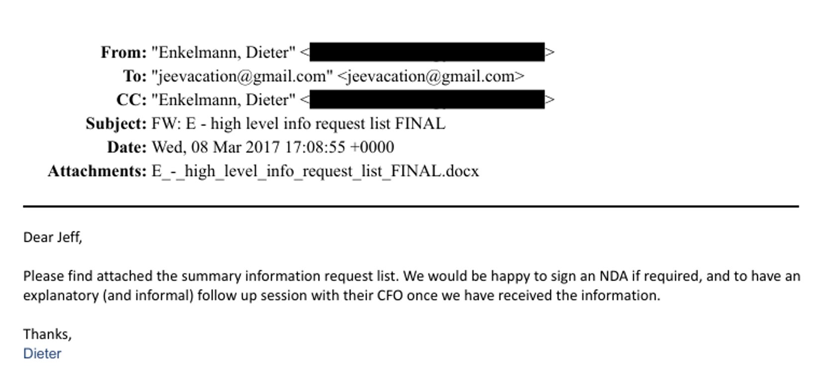 „Please find attached the summary information request list. We would be happy to sign a NDA if required, and to have an explanatory (and informal) follow up session with their CFO once we have received the information.“