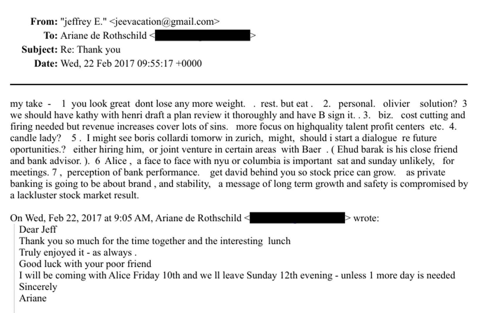 „I might see boris collardi tomorw in zurich, might, should i start a dialogue re future oportunities.?“, hatte Epstein per Mail Ariane de Rothschild zwei Tage vor dem Zürcher Treffen gefragt.