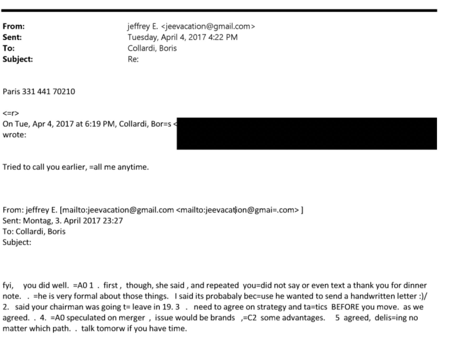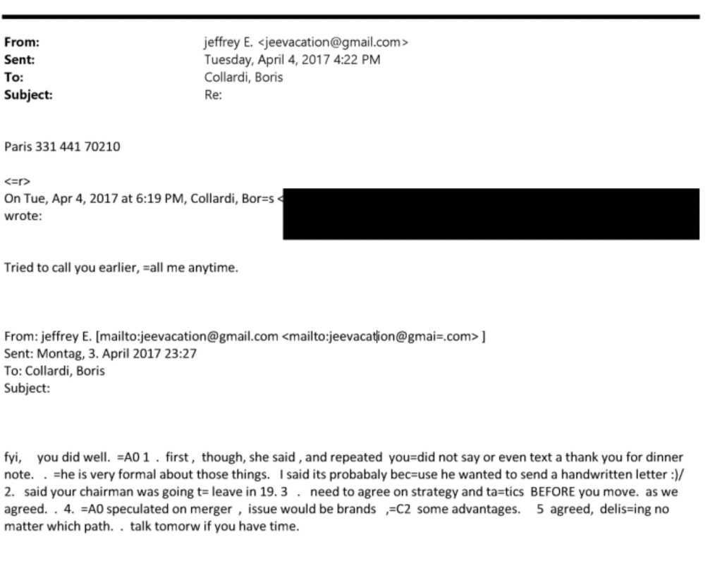 Im Gegenteil, Collardi kommunizierte mit jedem Mail vertraulicher mit dem Amerikaner. „Could you please call Boris on his mobile …“, mailte die Assistentin des Bär-CEOs Epstein.