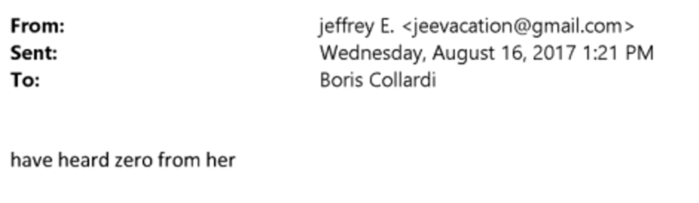 Erst im Spätsommer, ein halbes Jahr nach dem Initialtreffen in Zürich, zerschlug sich der Plan. „have heard zero from her“, antwortete Epstein am 16. August 2017 auf eine entsprechende Frage von Collardi.