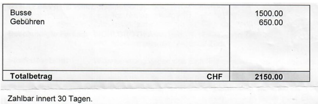 Der erste Betrag hatte es in sich: rund 2’150 Franken – Busse plus Verfahrenskosten. Eine Summe, die wirkt.