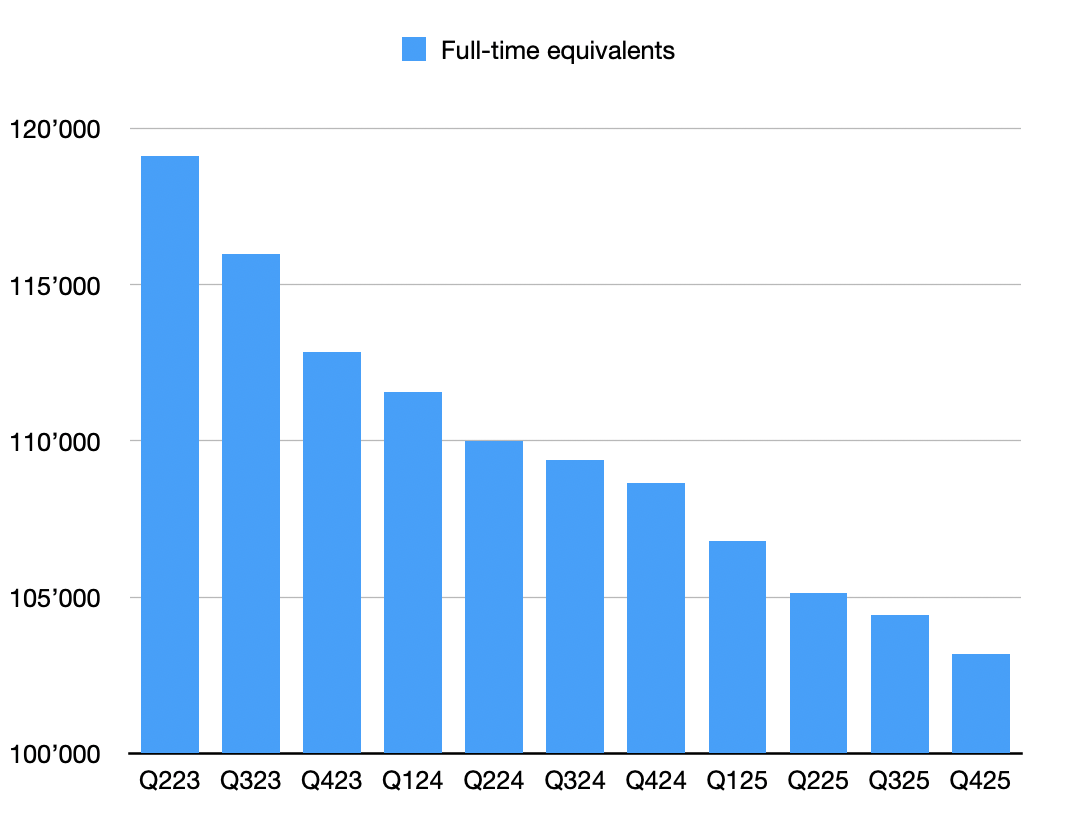 Dass der Personalbestand nicht einfach so schnell nach unten geht, liegt vor allem auch am Sozialplan. Die meisten, die im Laufe 2025 die Abbau-Nachricht erhalten haben, sind ja noch im Sozialplanprogramm „COACH“ und bleiben bis zu 12 Monate auf der Payroll. Auch die, welche nach Abschluss der Integration rausfallen werden, kommen in dieses Programm und fallen erst im Laufe 2027 von der Lohnliste…