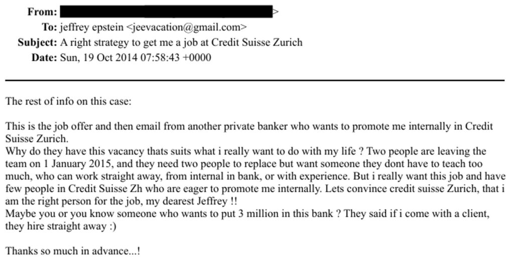 Jetzt brauche es noch mehr. „Lets convince credit suisse Zurich, that i am the right person for the job, my dearest Jeffrey !!“