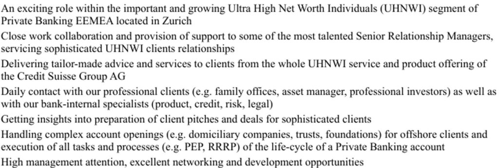 Die CS hatte es damals auf diese „important and growing“ Klientel abgesehen. Die gesuchte Person würde „some of the most talented Senior Relationship Managers“ unterstützen.
