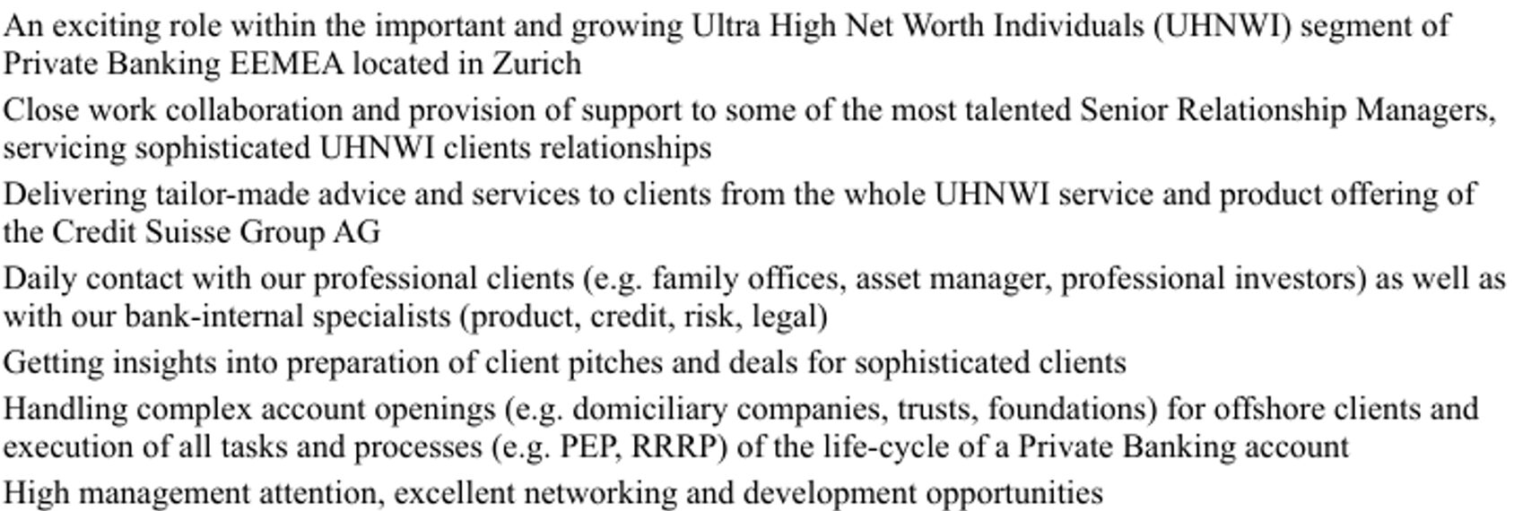 „Handling complex account openings (e.g. domiciliary companies, trusts, foundations) for offshore clients and execution of all tasks and processes (e.g. PEP, RRRP) of the life-cycle of a Private Banking account“.