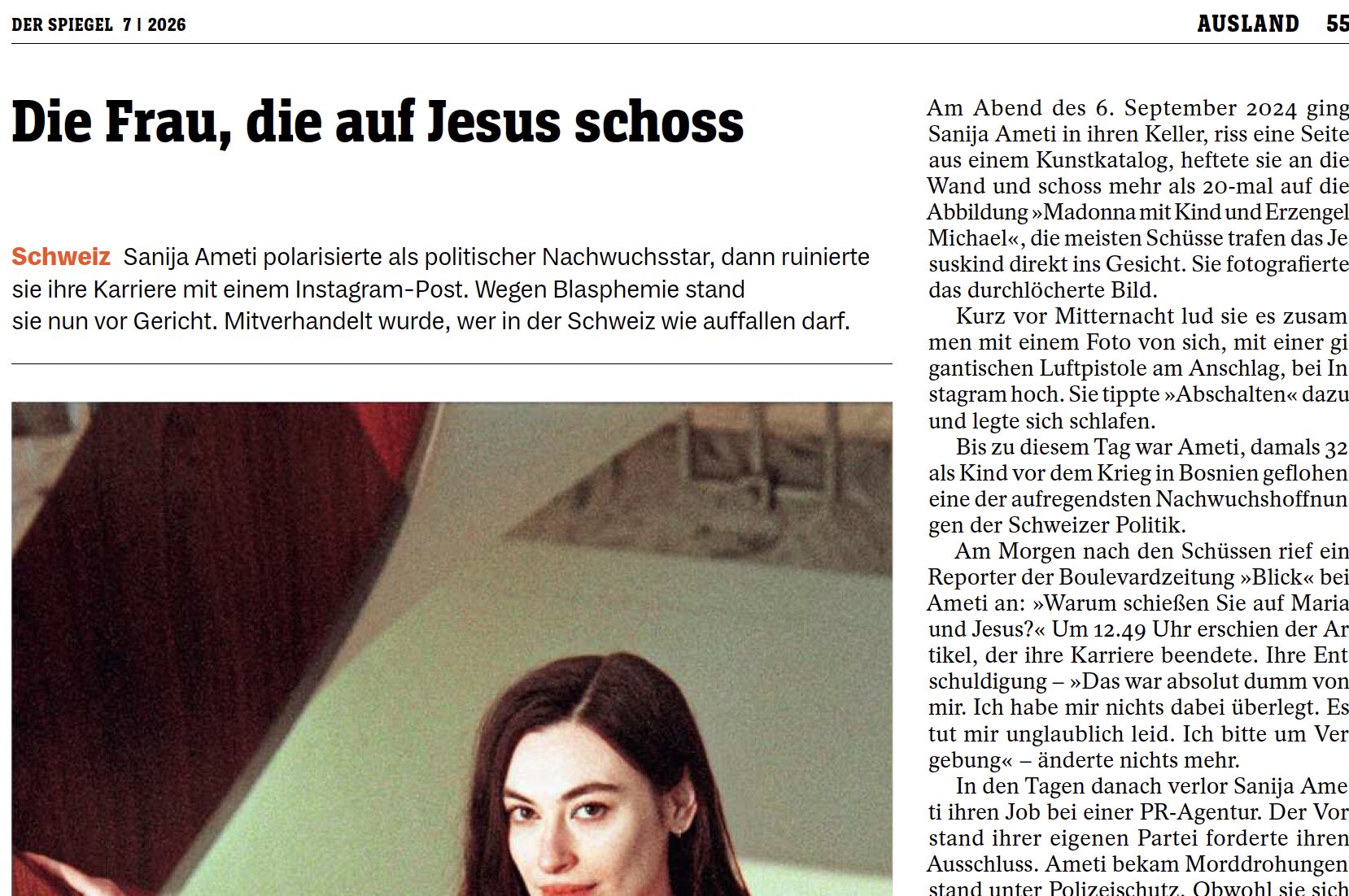 Zu den drei Vierteln einer Umfrage, die Ameti von der Politik ausschliessen wollten, meinte die Schweizerin im Magazin: „Das hat sich angefühlt wie eine Steinigungsfatwa in Iran“.