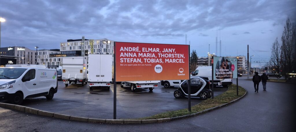 Vor dem Sunrise-Sitz prangt ein Plakat mit den Vornamen der Mitglieder der Geschäftsleitung.