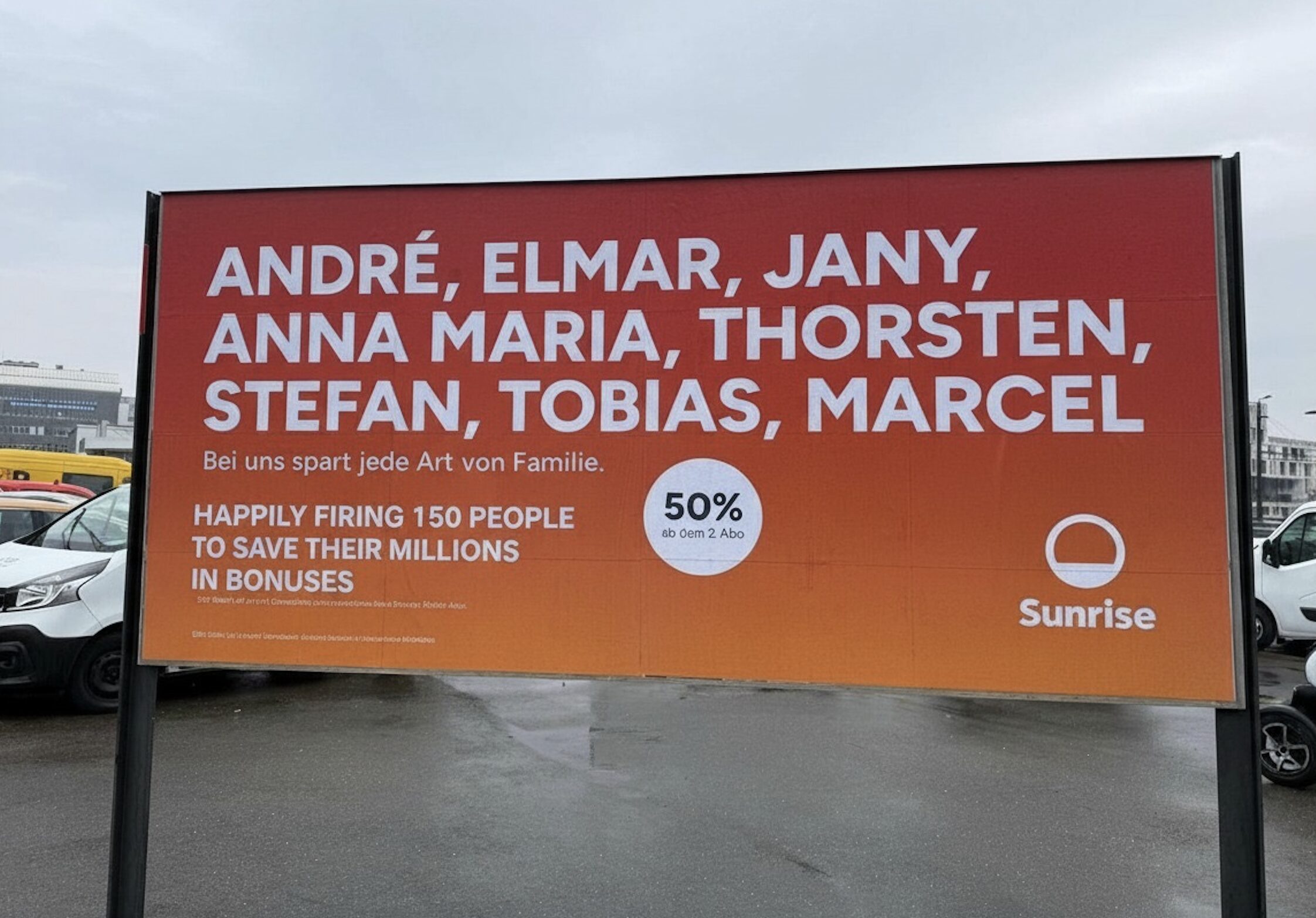 Unter den 8 Vornamen der obersten Sunrise-Köpfe steht jetzt: „Happily firing 150 people to save their millions in bonuses.“