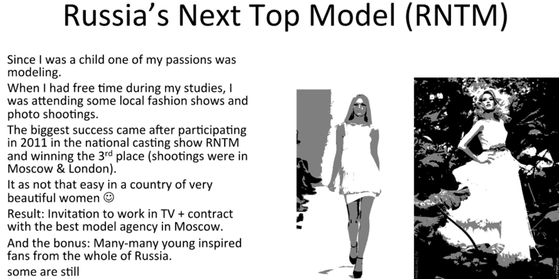 Der Erfolg in der Casting-Show habe sich positiv ausgewirkt. „Invitation to work in TV + contract with the best model agency in Moscow.“