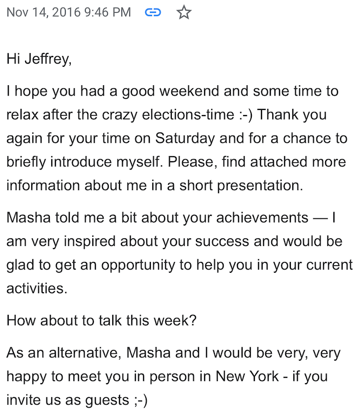 „I am very inspired about your success and would be glad to get an opportunity to help you in your current activities.“