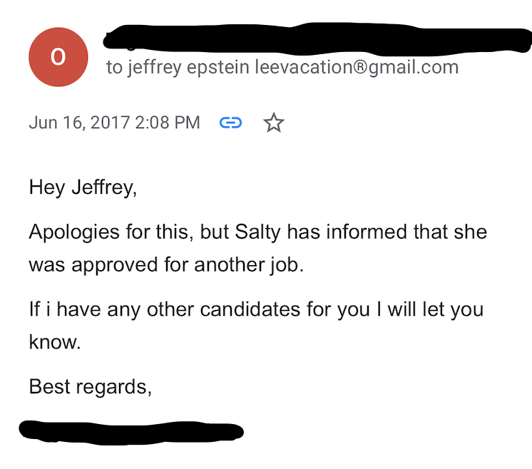 Sie habe sich für einen anderen Job entschieden, so die UBS-Bankerin zum Amerikaner im Frühsommer 2016. „If i have any other candidates for you I will let you know“, versprach sie Epstein.