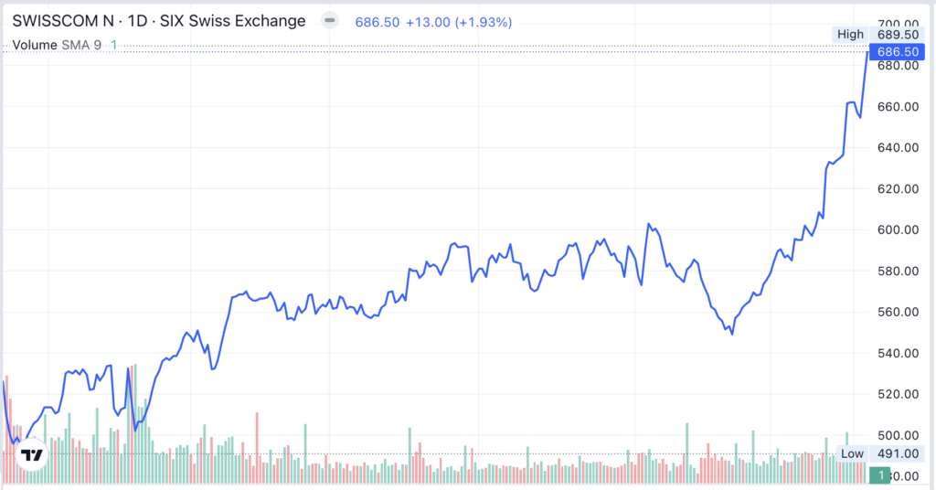 Die beiden Spitzenfrauen und ihre Kollegen zuoberst in der Swisscom-Führung können den Aktienkurs ihrer Firma ins Feld führen. Dieser steigt unaufhörlich.