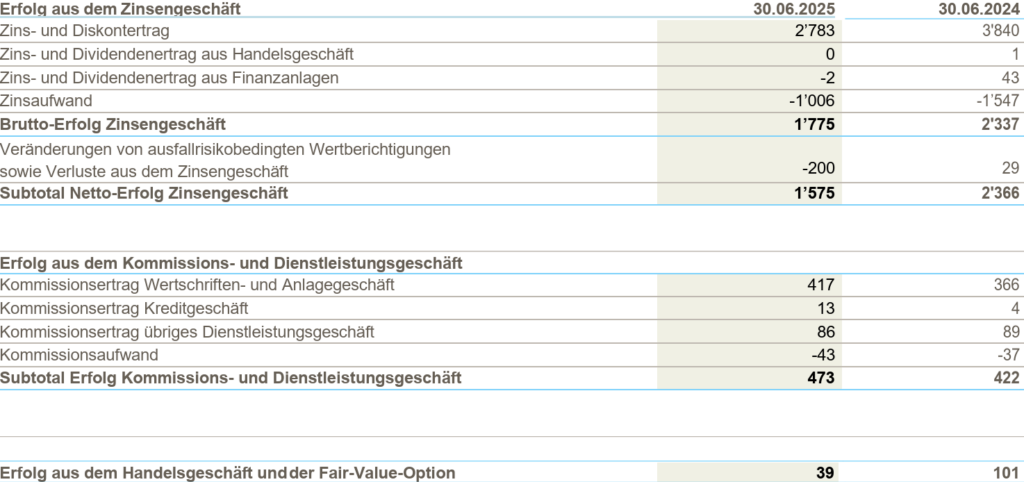 Im ersten Halbjahr 2025 tauchte die Regiobank Männedorf dann endgültig. Das überlebenswichtige Zinsergebnis, das schon 2024 deutlich zurückgegangen war, krachte von 2,4 auf 1,6 Millionen zusammen.
