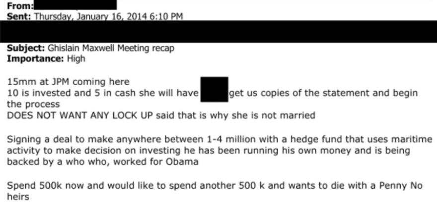 Maxwell transferierte ab 2014 mehrere Millionen zur UBS und gab an, dass sie ihr ganzes Vermögen bis zu ihrem Lebensende aufzehren wolle, da sie keine Nachkommen hätte.