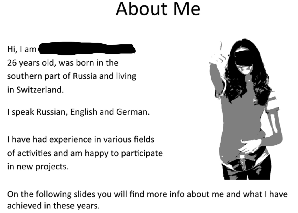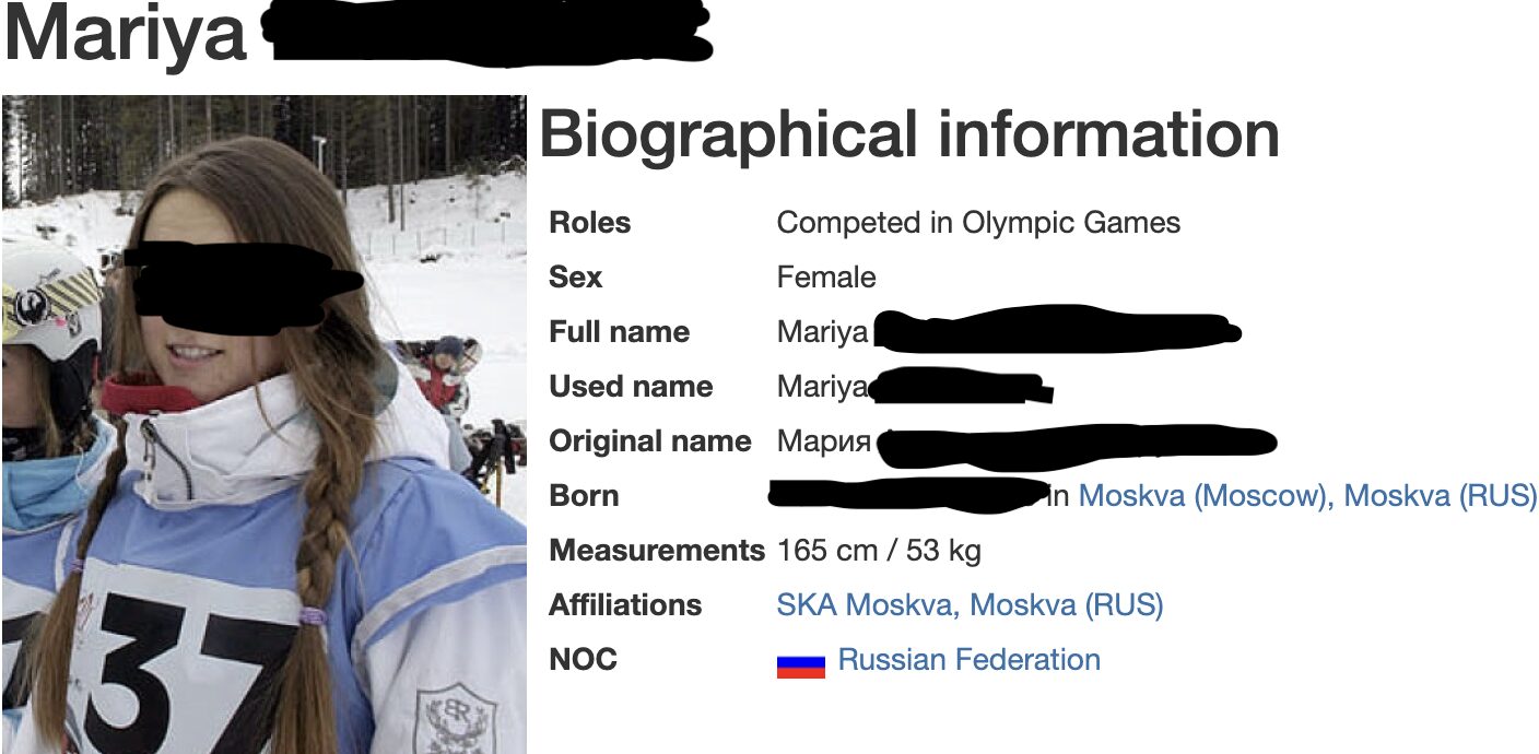 Bei der Vermittlerin handelt es sich um eine ehemalige russische Snowboard-Fahrerin. Sie nahm für ihr Heimatland an den Olympischen Spielen 2006 in Turin teil.
