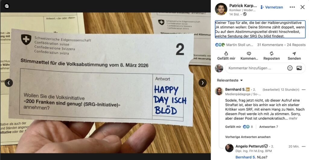 „Kleiner Tipp für alle, die bei der Halbierungsinitiative JA stimmen wollen: Deine Stimme zählt doppelt, wenn Du auf dem Abstimmungszettel direkt hinschreibst, welche Sendung der SRG Du blöd findest.“