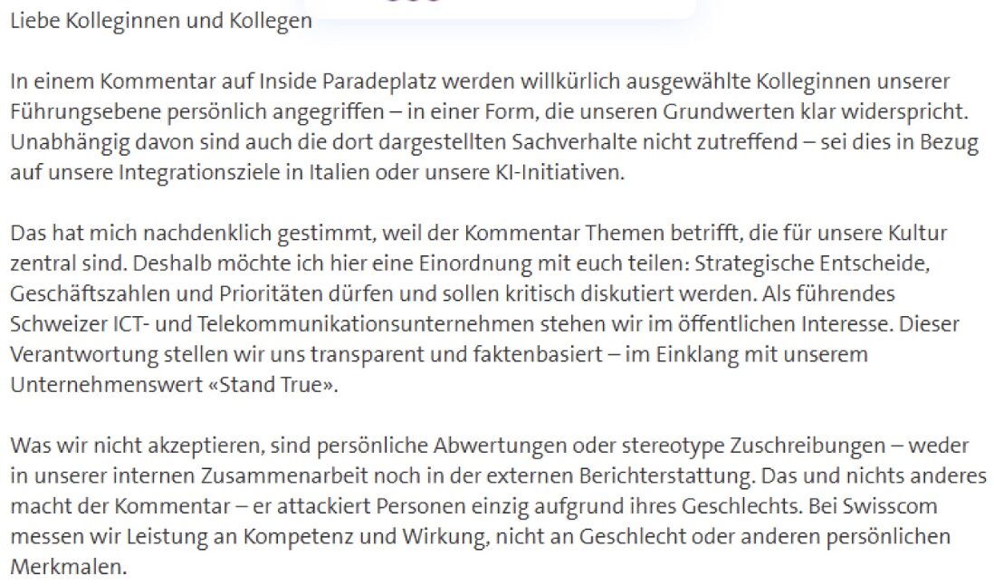„Denn sie leisten einen wichtigen Beitrag für eine erfolgreiche Zukunft von Swisscom“. Ein jammernder CEO, der meint, Frauen hätten solchen Support nötig.