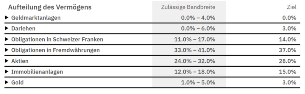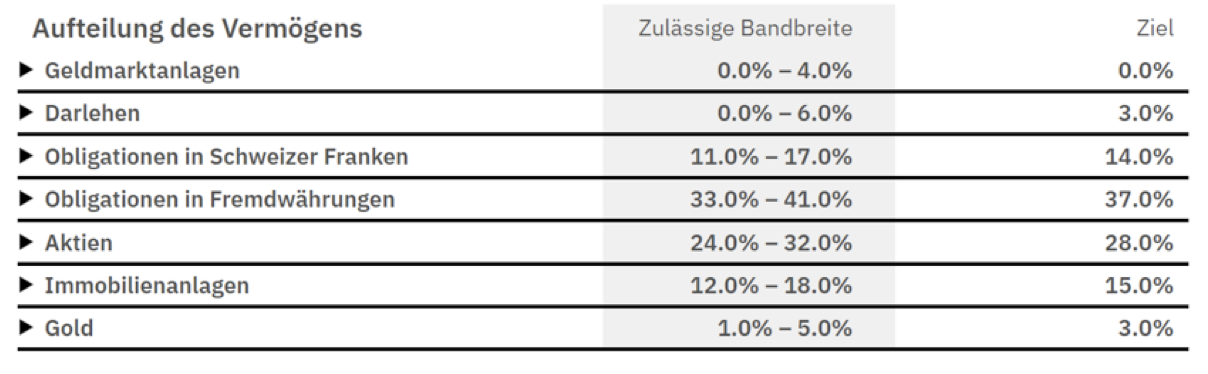 Um dies zu erreichen, definiert sie Bandbreiten, um konservativ in Geldmarktanlagen, Oblis, Aktien, Immobilien und Gold zu investieren.