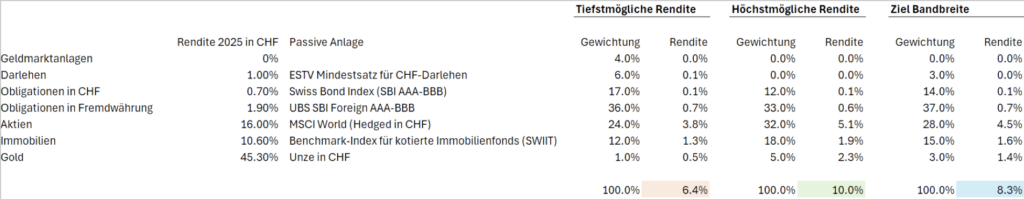 Der Einfachheit halber bilden wir die Anlageklassen mit passiven Anlageprodukten ab, welche die Durchschnittsrenditen der Anlagen in Franken in 2025 repräsentieren.