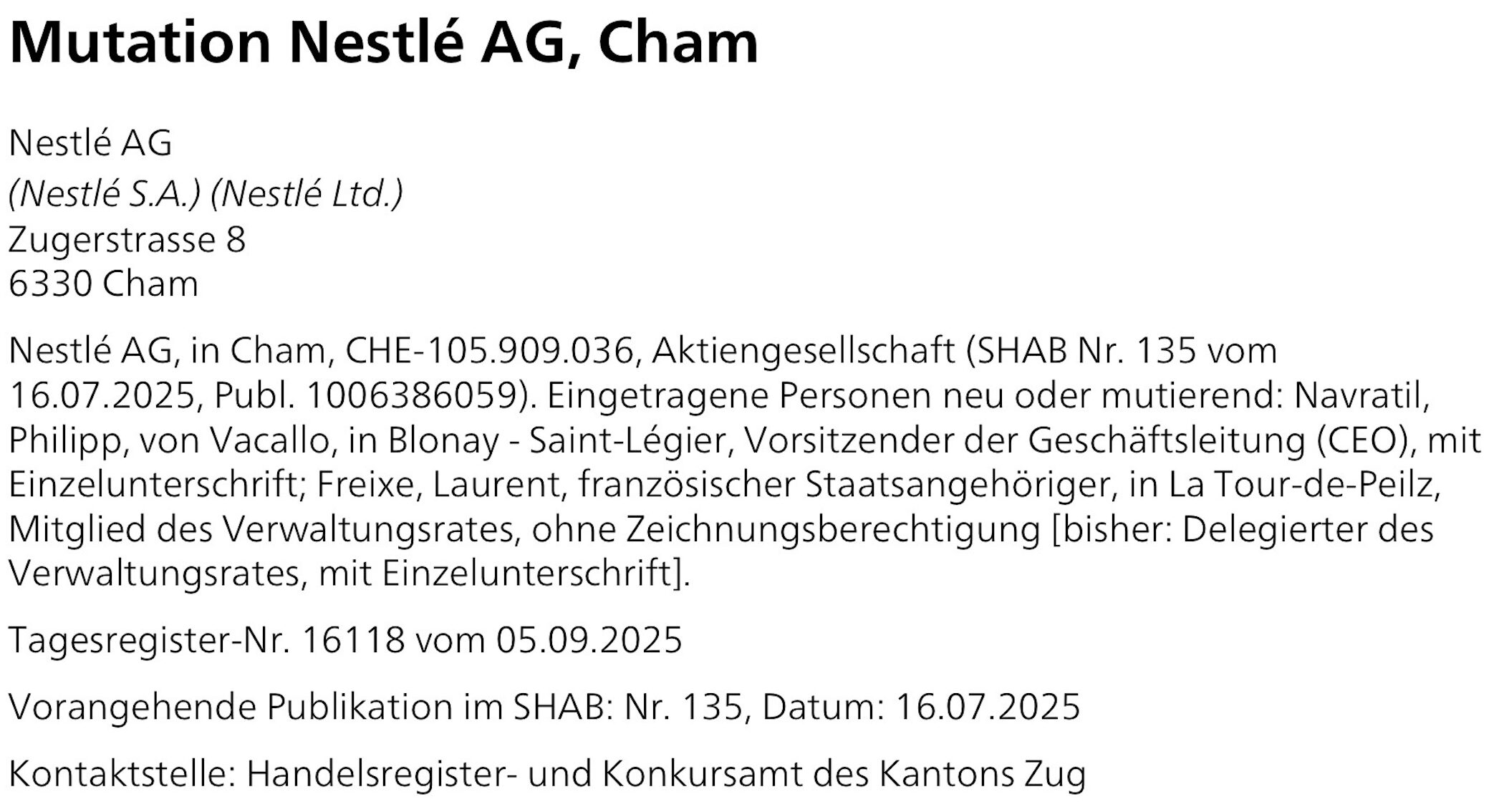 Für Laurent Freixe gab es keinen Rappen mehr. Dafür ist er hartnäckig in den Handelregisterauszügen von Nestlé S.A. in Vevey und Nestlé AG in Cham präsent.