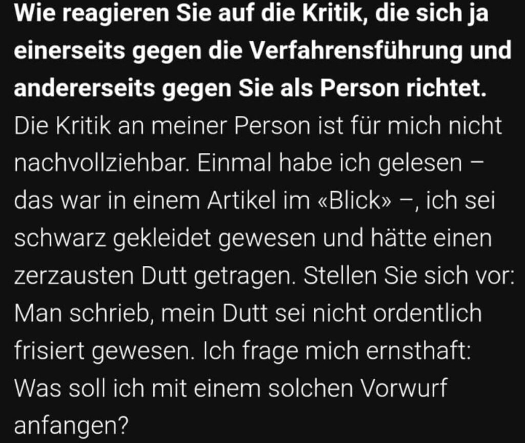 Im „Blick“ sei gestanden, sie sei „schwarz gekleidet gewesen und hätte einen zerzausten Dutt getragen“, führt Beatrice Pilloud, die Frau im Zentraum der Ermittlungen, in einem Interview mit dem Walliser Lokalmedium Pomona aus.