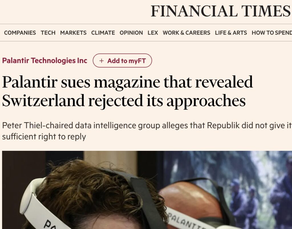 „Palantir sues magazine that revealed Switzerland rejected its approaches“, titelt die FT, darunter steht: