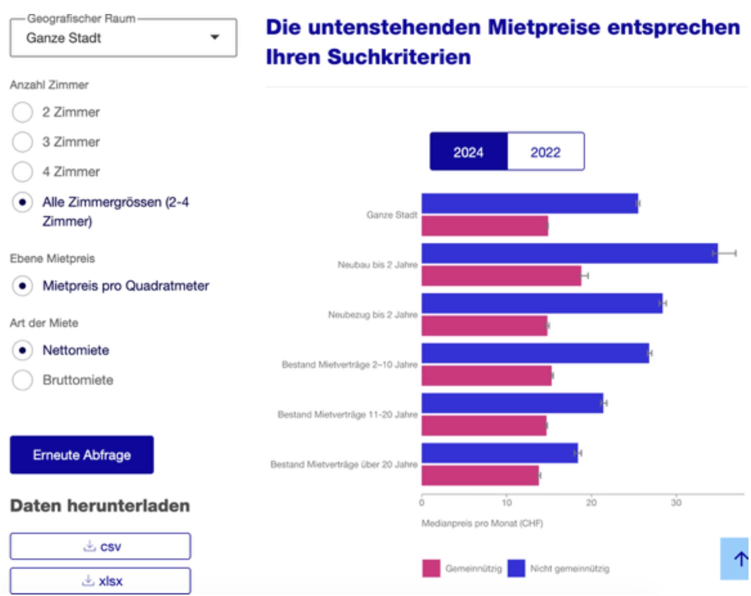 Die Daten enthalten Werte aus 2022 und 2024. Sie zeigen Medianpreise, differenziert nach Zimmerzahl, Baualter, Eigentümerkategorie sowie nach Stadtkreisen und Quartieren.