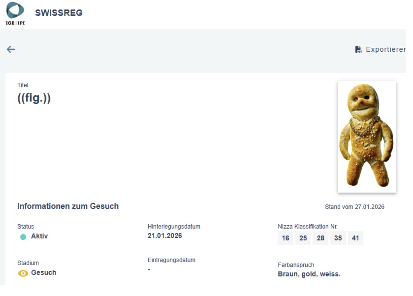 Der Grittibänz soll geschützt werden. Niemand anderes darf die Idee eines tanzenden Grittibänz in braun, gold, weiss (Farbanspruch) nochmals verwenden.