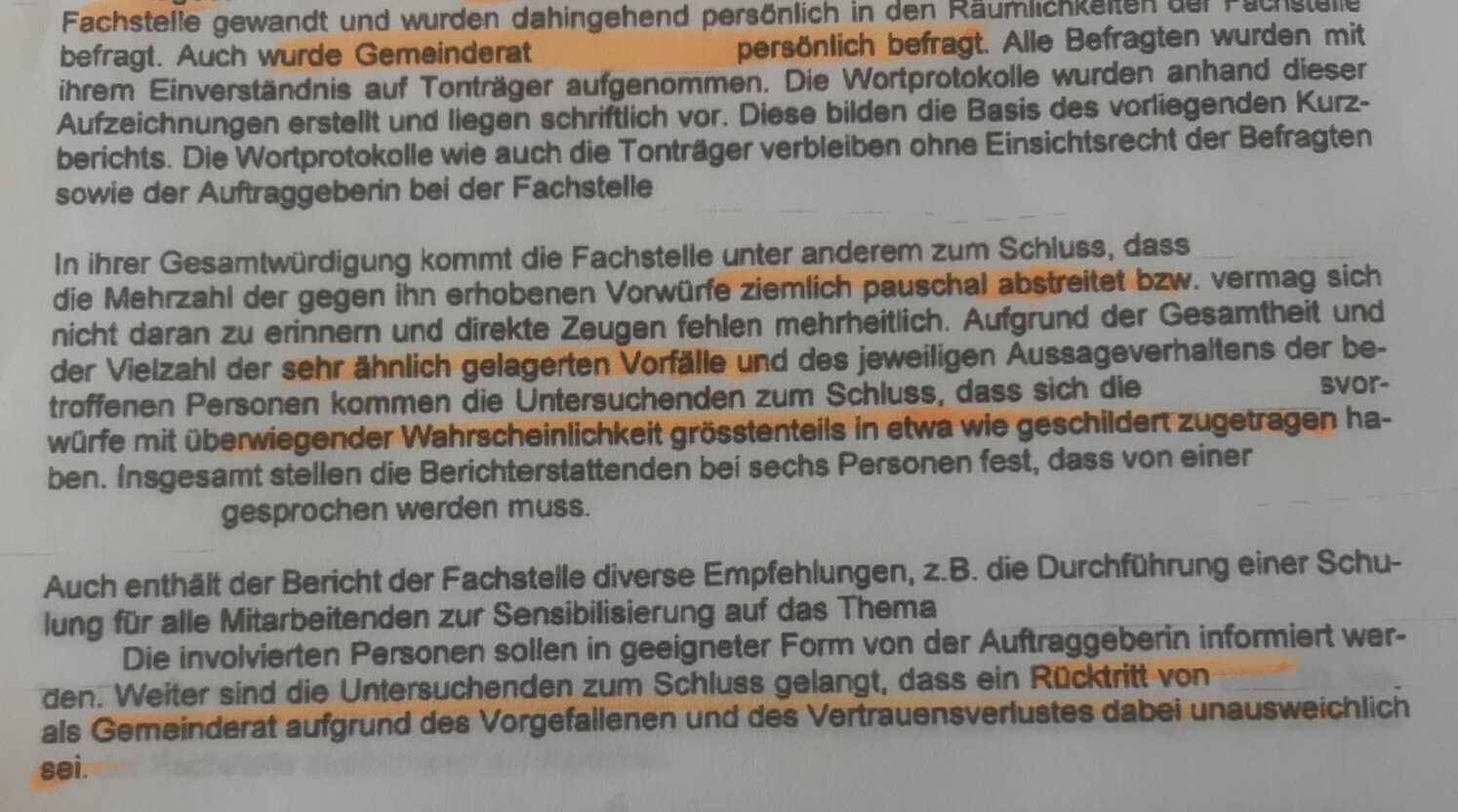 Die offen gelegten Seiten sind zwar übersät mit abgedeckten Stellen. Trotzdem kommt rund um die vor Monatsfrist bekannt gewordenen Belästigungsvorwürfe das Entscheidende zum Vorschein.