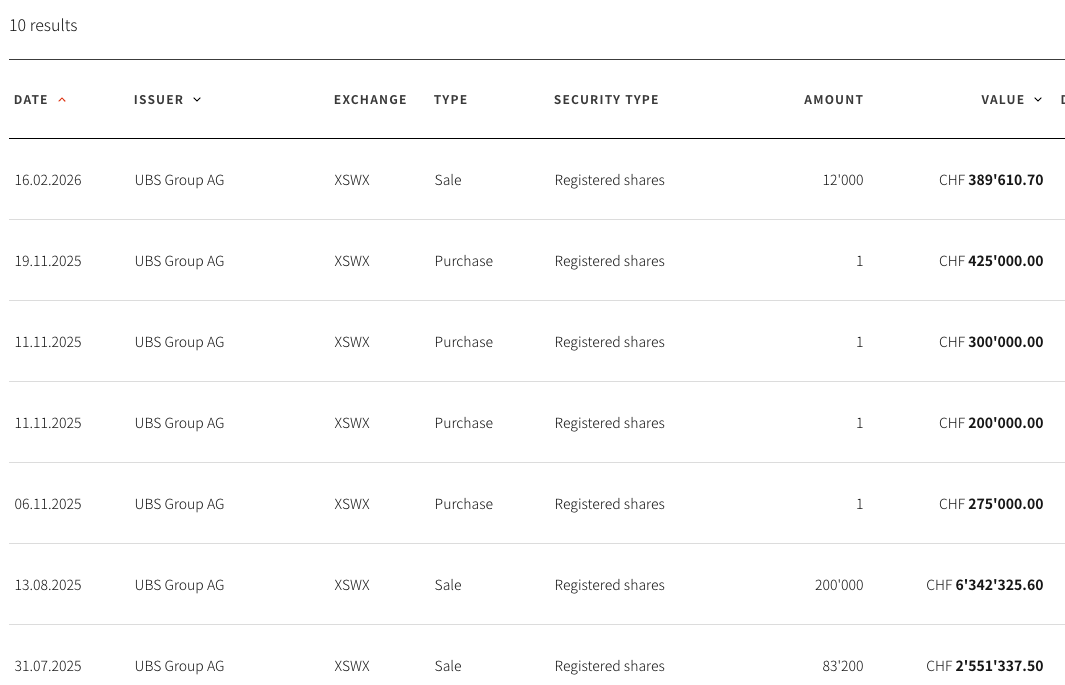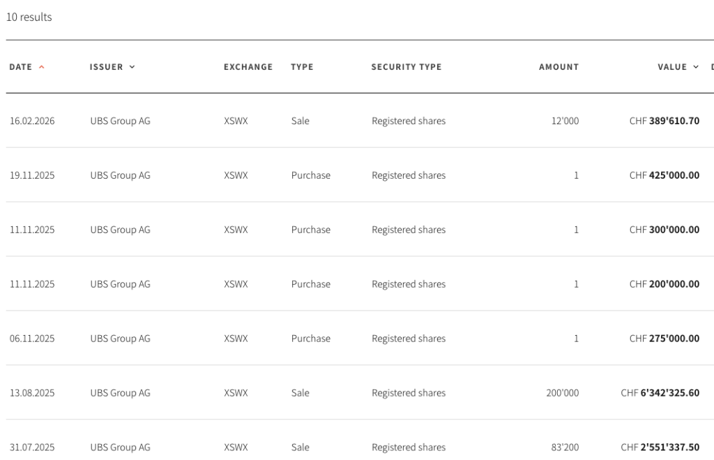 Kein Wunder, warten die Topshots mit Verkäufen eigener Aktien zu. Gerade mal einer hat seit der Zahlen-Publikation von Anfang Februar UBS-Titel auf den Markt geschmissen.