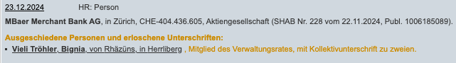 Für Bignia Vieli ein No-Go. Sie legte ihr Amt nieder. Am Tag vor Heiligabend 2024, nach nur anderthalb Jahre zuoberst, war ihr Mandat bei der MBaer Merchant bereits beendet.