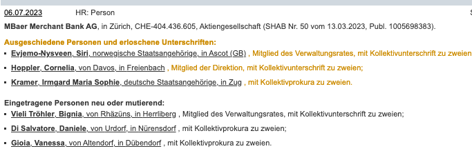 Im Juli 2023 wählten die MBaer-Aktionäre, darunter Kunden der Bank, die Rechtsanwältin in den Verwaltungsrat.