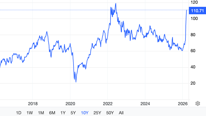 Heute, 2026, wiederholt sich die Geschichte auf dramatische Weise. Seit Beginn des Iran-Krieges steigen die Ölpreise kontinuierlich – Brent kratzt bereits an der 110-Dollar-Marke.