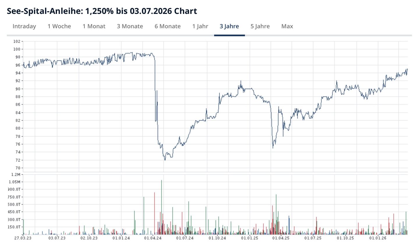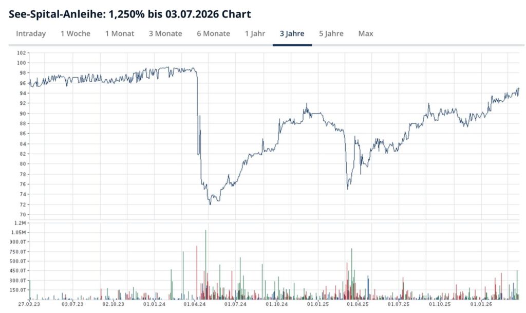 Bereits zwei Mal ist die Anleihe regelrecht gecrasht: Jeweils im Frühling 2024 und 2025. Die Verwerfungen am Bondmarkt in Zusammenhang mit dem 170-Millionen Zahlungsaufall beim Spital Wetzikon dürften eine Rolle gespielt haben.