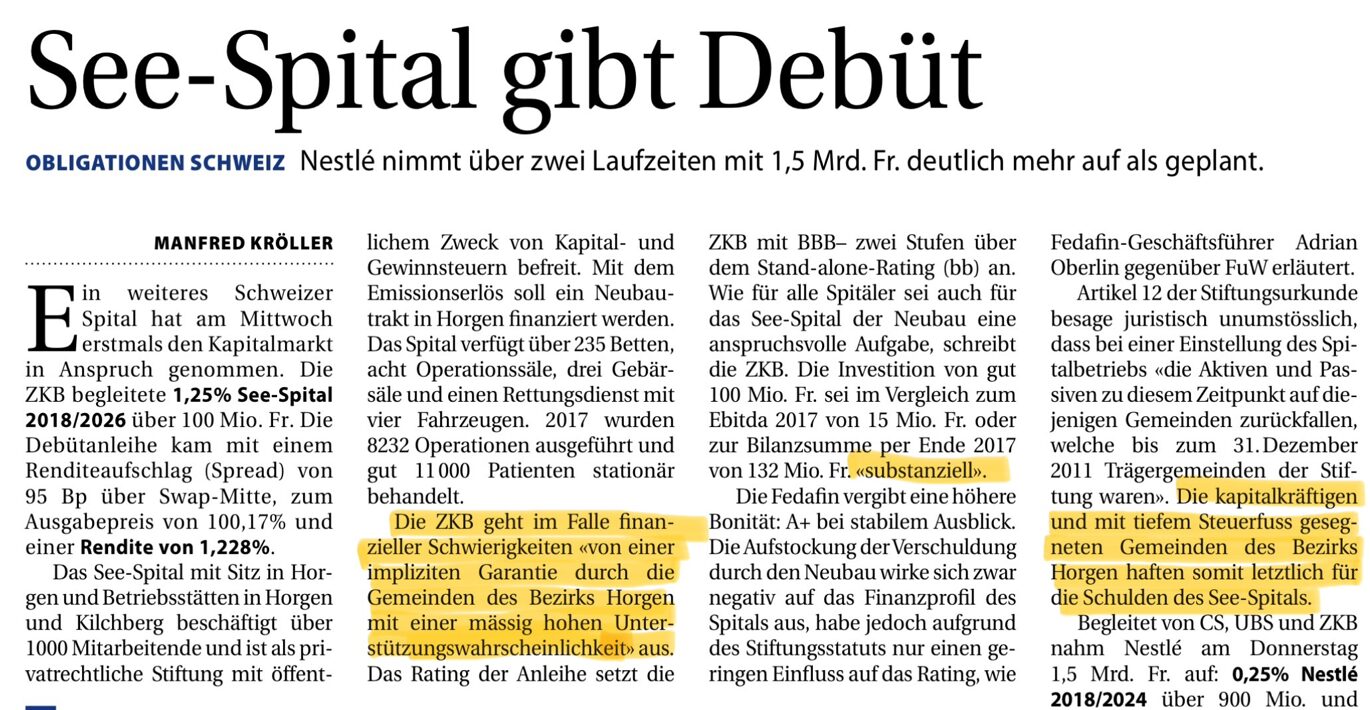 Danke, dass Sie meinen Hinweis aufgenommen haben. Der Erlös des Spital Kilchberg wird das Loch nicht stopfen können. Für eine finanzielle Unterstützung durch die Anrainer-Gemeinden reicht die Zeit nicht. Der Markt geht aktuell nicht von einem Default der Anleihe aus da die Anzahl Notfälle und Geburten nicht von den Zürcher Stadtspitälern aufgenommen werden kann ohne signifikanten Ausbau. Das See-Spital ist für das linke Seeufer womöglich unverzichtbar. In Horgen hofft man auf die Rettung durch den Kanton. Vorerst wird sich das See-Spital in die Nachlassstundung begeben.