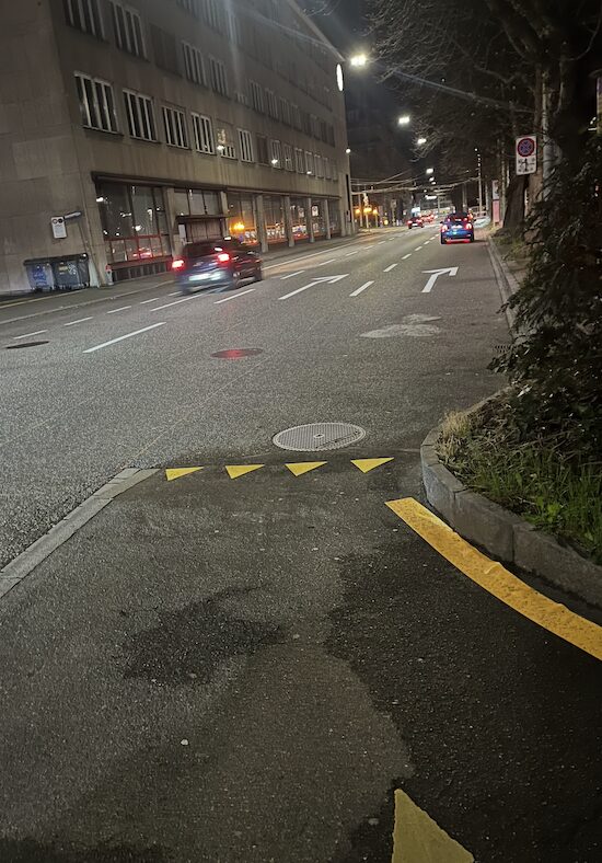 Und der Kanton? Der schlägt zurück. Heute früh war die Spur für die Autos wieder hergestellt, der Veloweg endete mitten auf der Strecke.