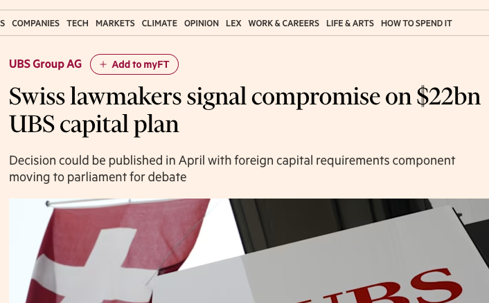 Jetzt meldet die FT, dass gewichtige Berner Politiker der UBS-Spitze grosse Erleichterung versprochen hätten. Sie würden „the problem by agreeing on a compromise” für die Grossbank lösen, so das einflussreiche Finanzblatt.