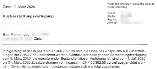 Im März 2026 strich die Stadt Zürich auch die Zusatzleistungen und forderte über 20’000 Franken zurück, weil sie – aus unerklärlichen Gründen – annahm, F.B. beziehe keine AHV mehr. Beschwerde wurde sofort eingereicht.