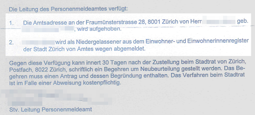 Ende März 2024 kam der Schock: Das Personenmeldeamt der Stadt Zürich hob die Amtsadresse auf und strich – von Amtes wegen – F.B. vollständig aus dem Einwohnerregister.
