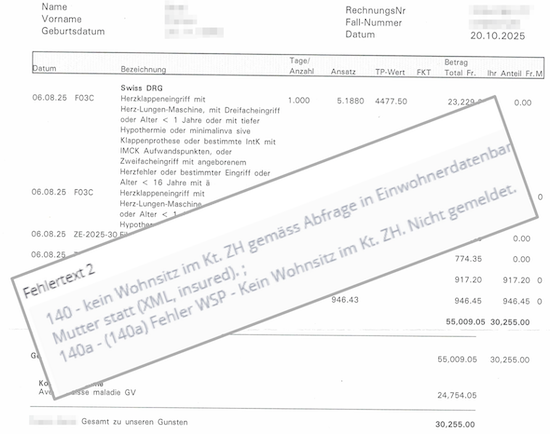 Die Krankenkasse hatte 45 Prozent der Spitalrechnung übernommen, aber der Kanton Zürich lehnte seinen Anteil (55 Prozent, 30’255 Franken) ab.